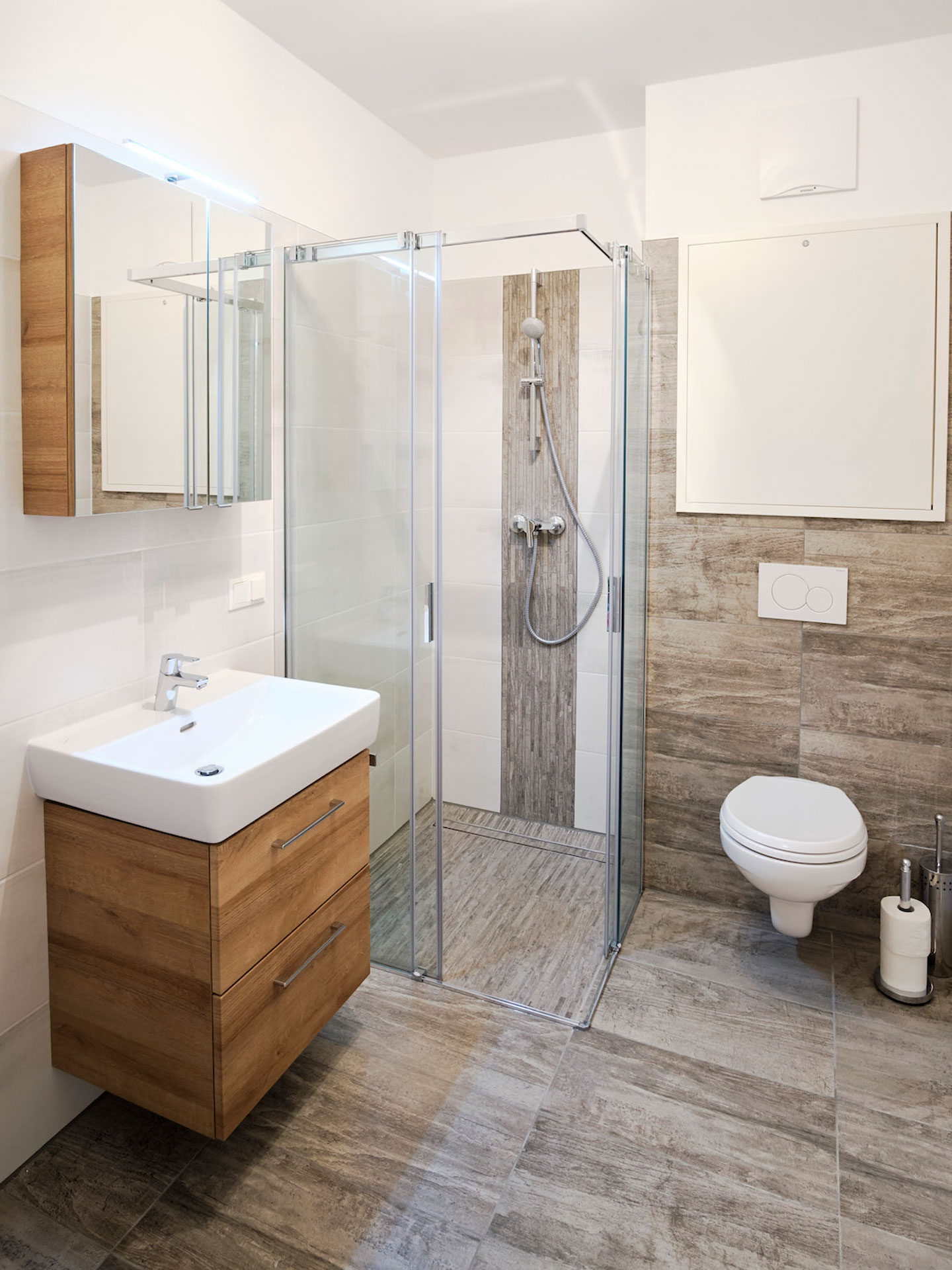 The two master bedrooms are tastefully decorated and equipped with quality beds (180x200cm) of the sleeping system “SwissFlex” equipped, as is the children's/youth room, which has a bunk bed and is adjacent to one of the master bedrooms. The villa has two bathrooms, one with a walk-in shower and the second bathroom with a shower/bathtub.