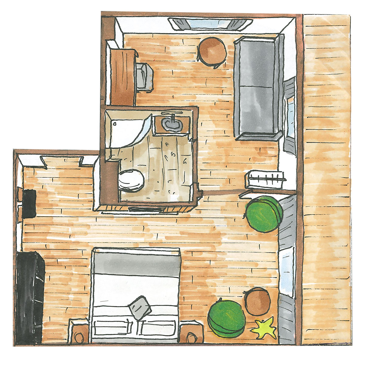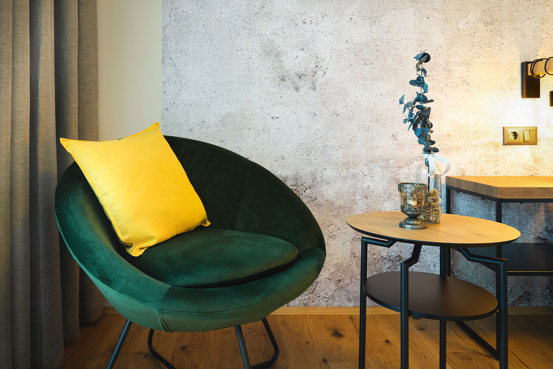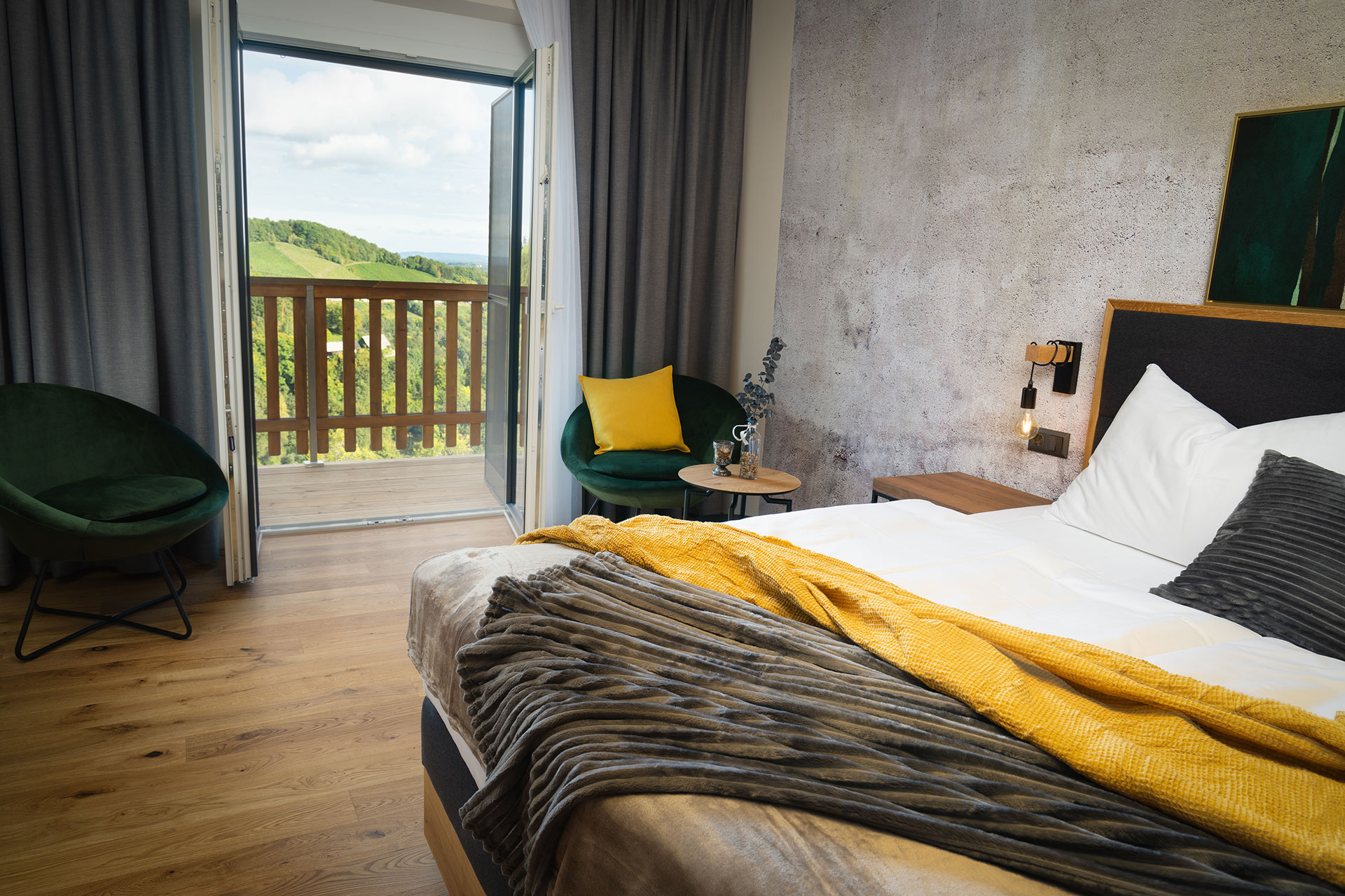 The delightful junior suite "Ahorn" (approx. 34 m2) with balcony can be booked for 2 adults + 2 children up to 14 years. It has 1 living/sleeping area, 1 separate room with sofa bed, 1 home office space and 1 bathroom with toilet/shower. From the rooms and the balcony you have a wonderful view of the southern Styrian hills.