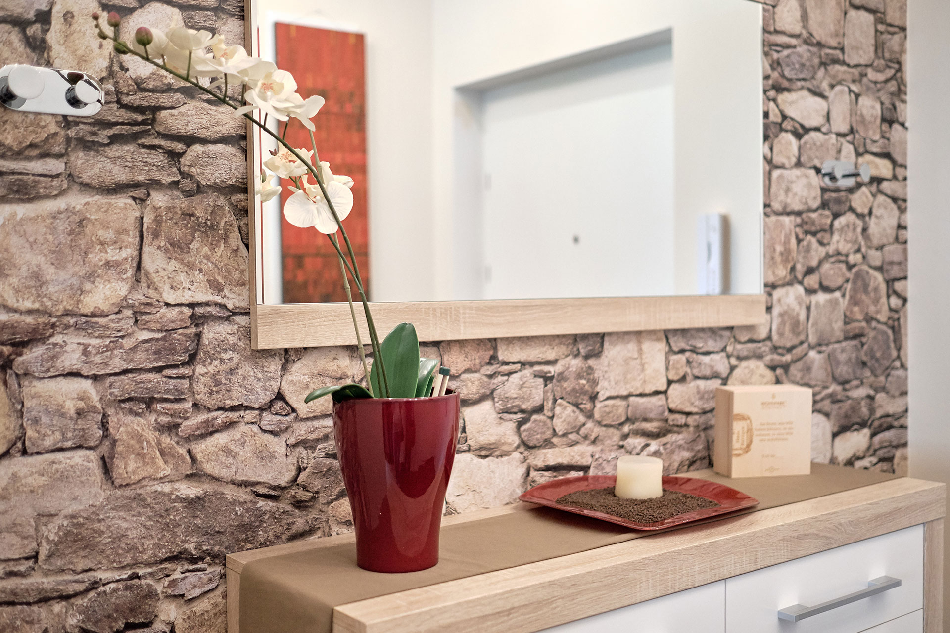 The Moroccan carvings complete the upscale ambience in the bedroom. From the bedroom you can go directly to your own waterfall with biotope - a cosy place that invites you to dream and linger. The modern kitchen has a fridge, 4-ring ceramic hob, oven, stainless steel extractor hood, dishwasher, Nespresso coffee machine, toaster and everything you need on holiday. There is also a beautiful shower room with towels, bathrobe and hairdryer, from here you have direct access to the wellness area.